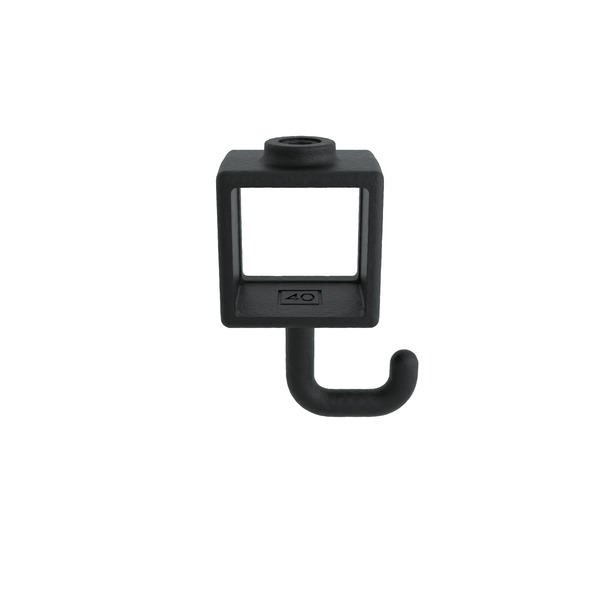 Der schwarze Stellring mit verdrehtem Haken für 40×40 mm Quadratrohre verbindet modernes Design mit hoher Funktionalität. Seine pulverbeschichtete Oberfläche macht ihn ideal für sichtbare Konstruktionen im Innen- und Außenbereich.